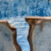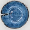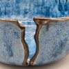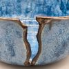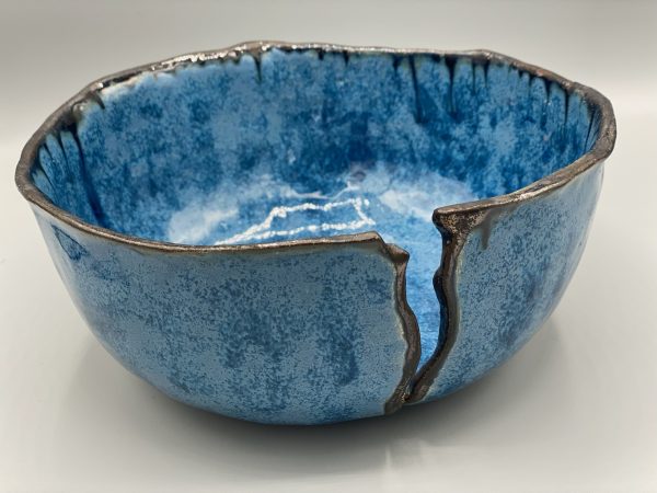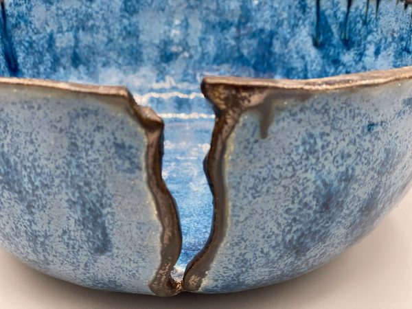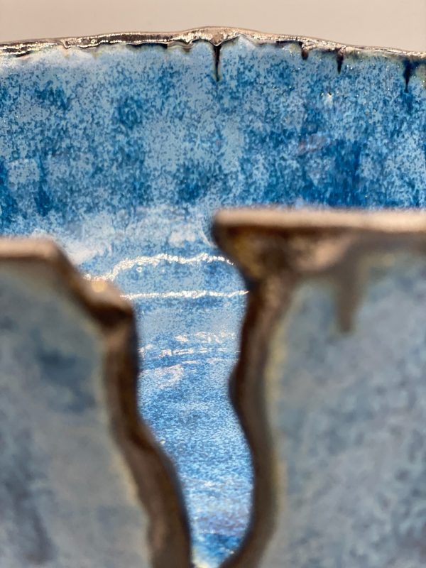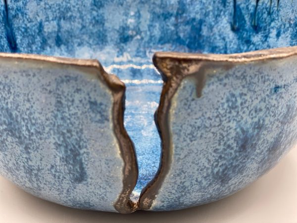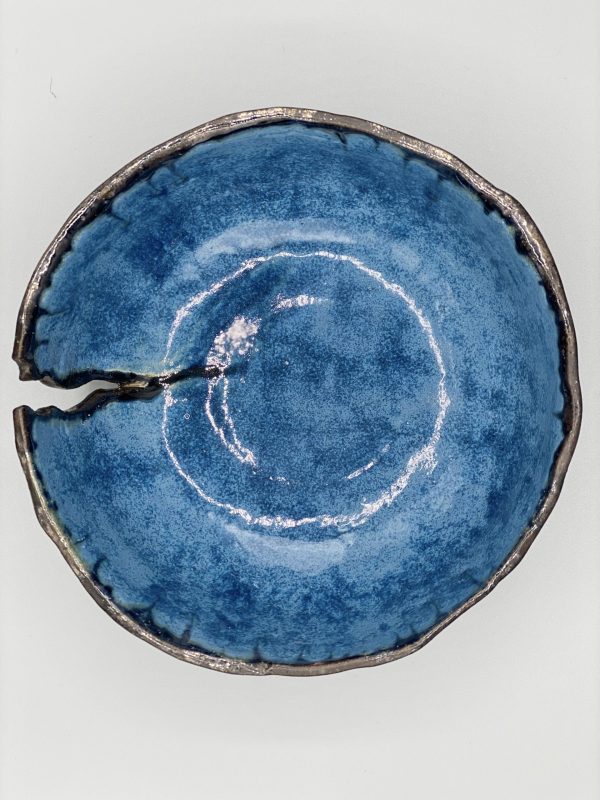 Aus grauem Ton moderierte Schüssel mit großem Schrumpfungssprung, der beim Trocknen des Materials vor dem erste Brand entstanden war. Danis kreatives Gespür verwandelte dieses Missgeschick in eine der wohl aufregendsten und menschlichsten Ton-Kreationen. Nach dem Brand wurde die Schüssel zweifarbig glaciert. Der dunkle, braun bis golden schimmernde Rand harmoniert mit den besonderen Blautönen.