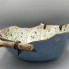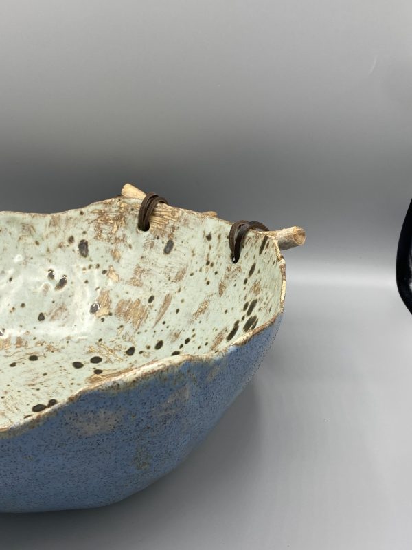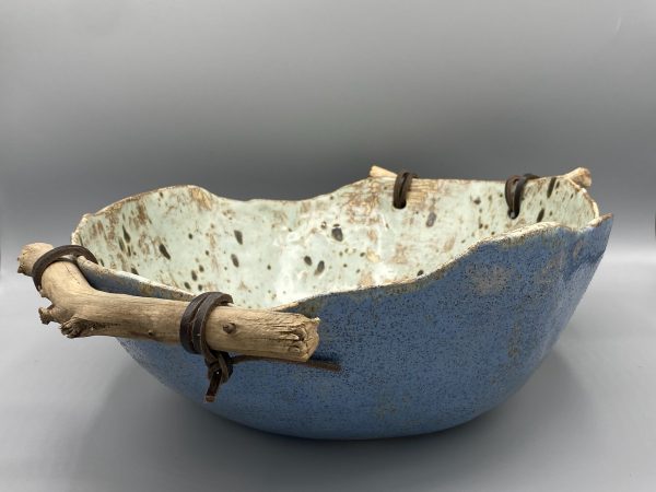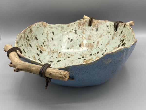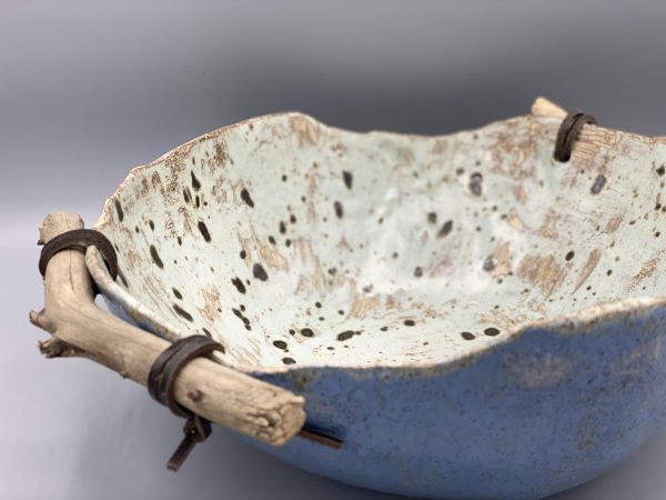 Dieses Schüssel wurde in Lemnos geformt und anschließen bei 1200 Grad gebrannt – nach dem Umzug nach Österreich, liebevoll glaciert und mit griechischem Schwemmholz und Lederbändern abgerundet.