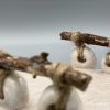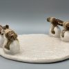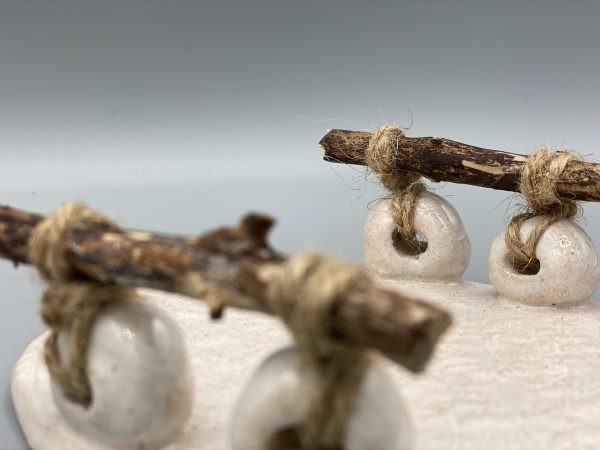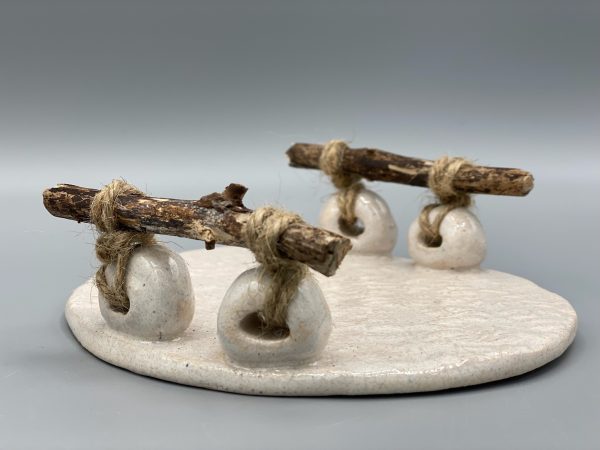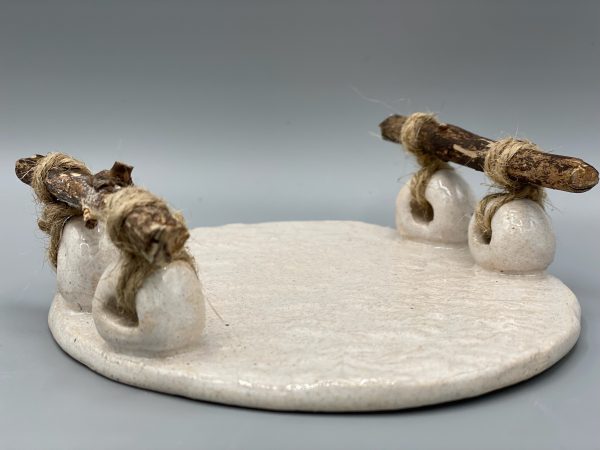 Diese kleine Servier Platte wurde aus Ton geformt und bei 1200 Grad gebrannt. Die helle cremefarbene Glasur steht im guten Kontrast zu den heimischen Schwemmholz-Griffen die mit zierlichen Naturhanf-Schnüren befestigt sind.